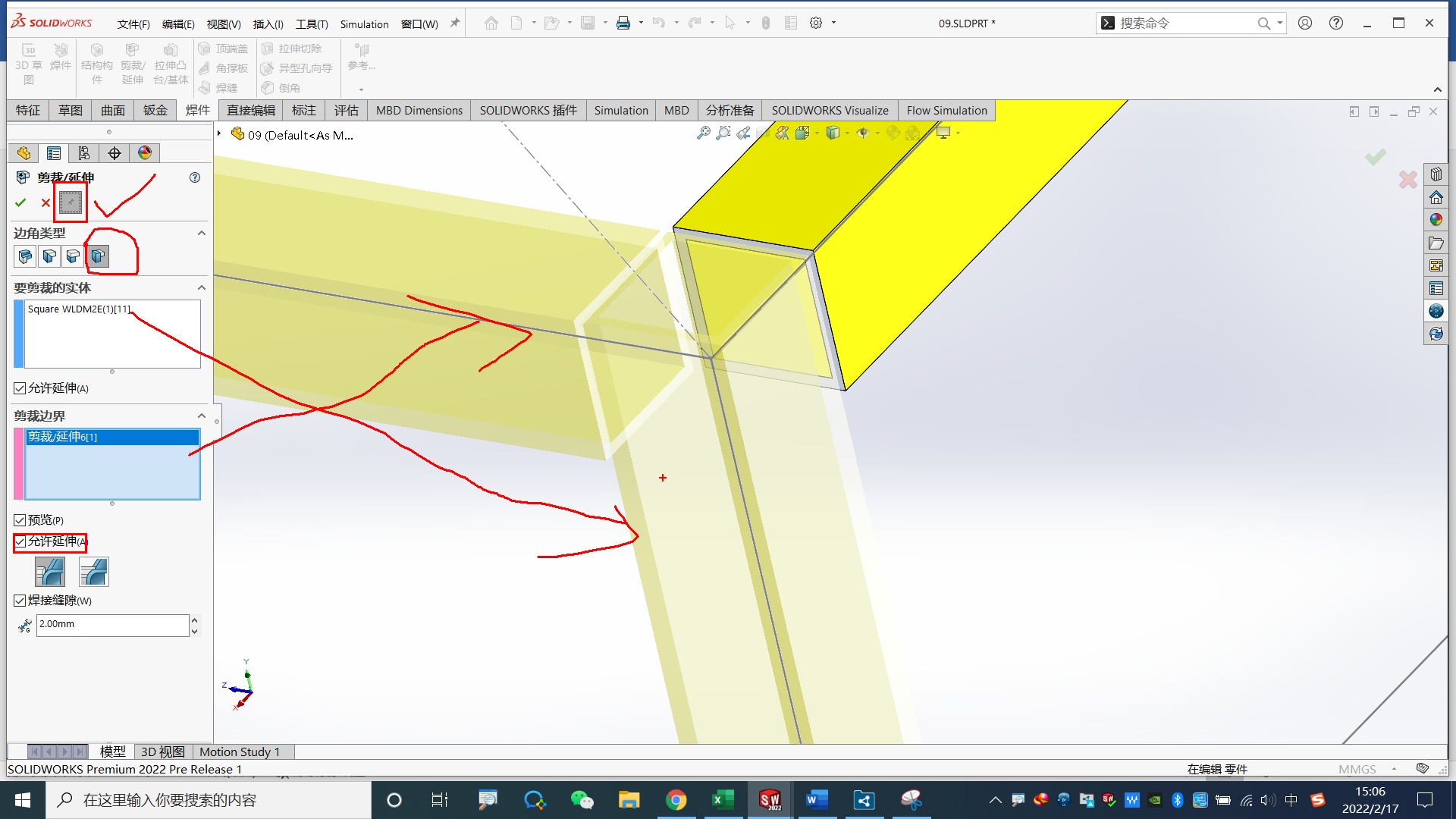 您应剪裁焊件模型中的所有边角以确定线段的长度能精度计算,您可使用剪裁/延伸来剪裁或延伸: